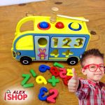U setu se dobija drveni autobus, čekić, 3 kuglice i brojevi za ubacivanje u odgovarajući otvor.