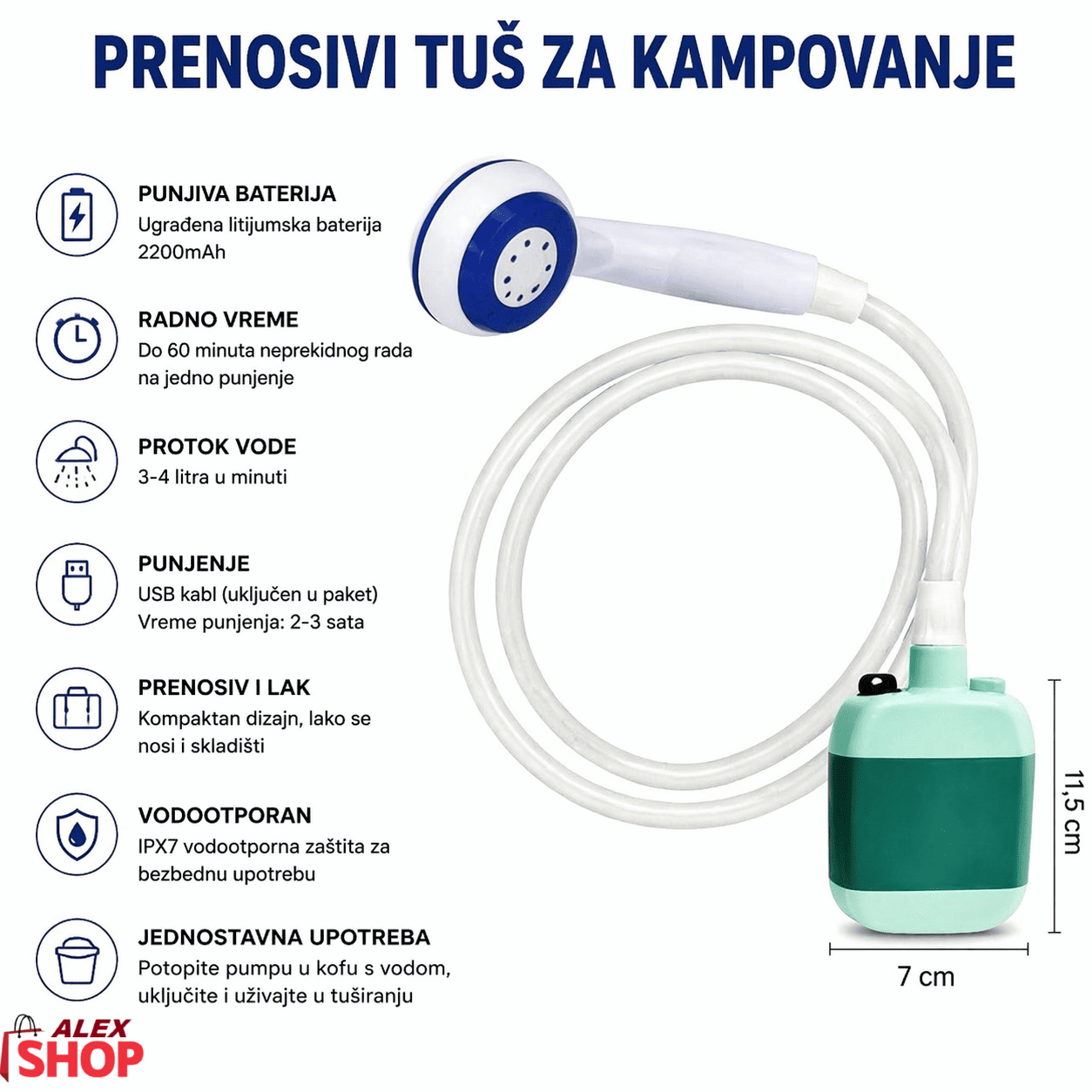 Prenosivi tuš za kampovanje sa punljivom baterijom je inovativan proizvod koji će vam olakšati sve vaše vanjske avanture. Sa njegovim kompaktnih dizajnom, dugotrajnim punjenjem i vodootpornošću, ovaj proizvod je savršen suputnik za svakog ljubitelja prirode. Uživajte u jednostavnom i praktičnom rešenju koje će unaprediti vaš boravak na otvorenom.